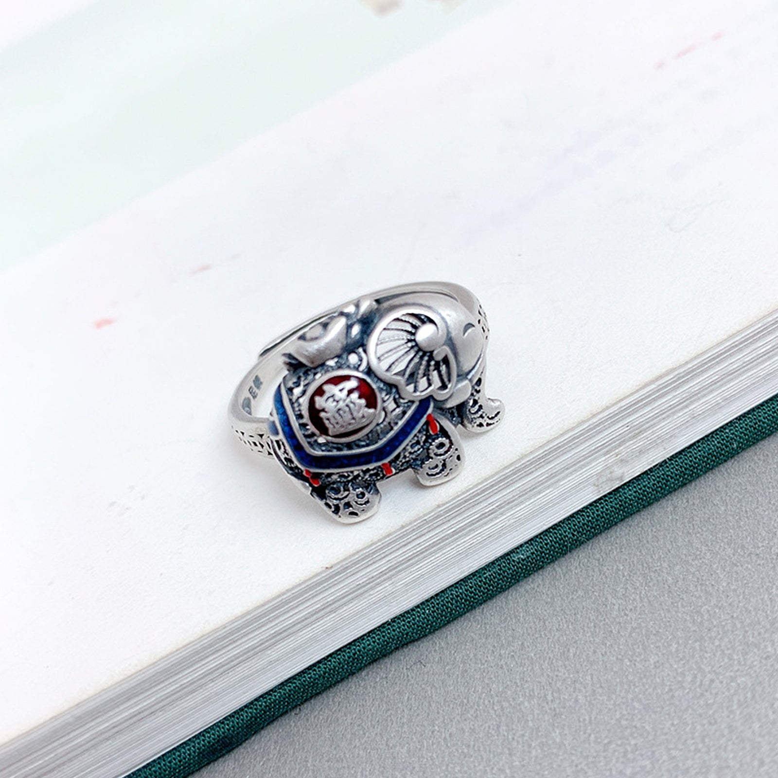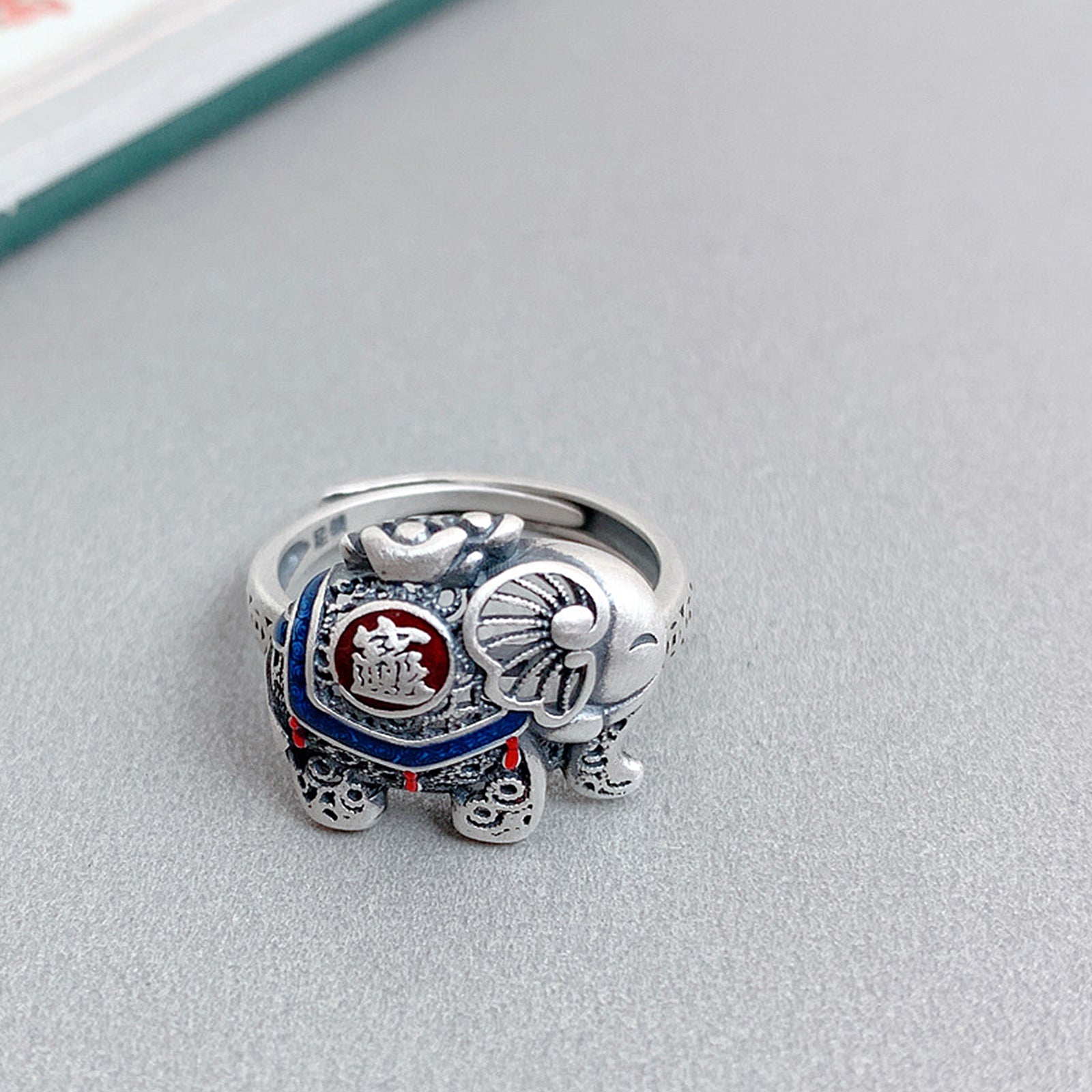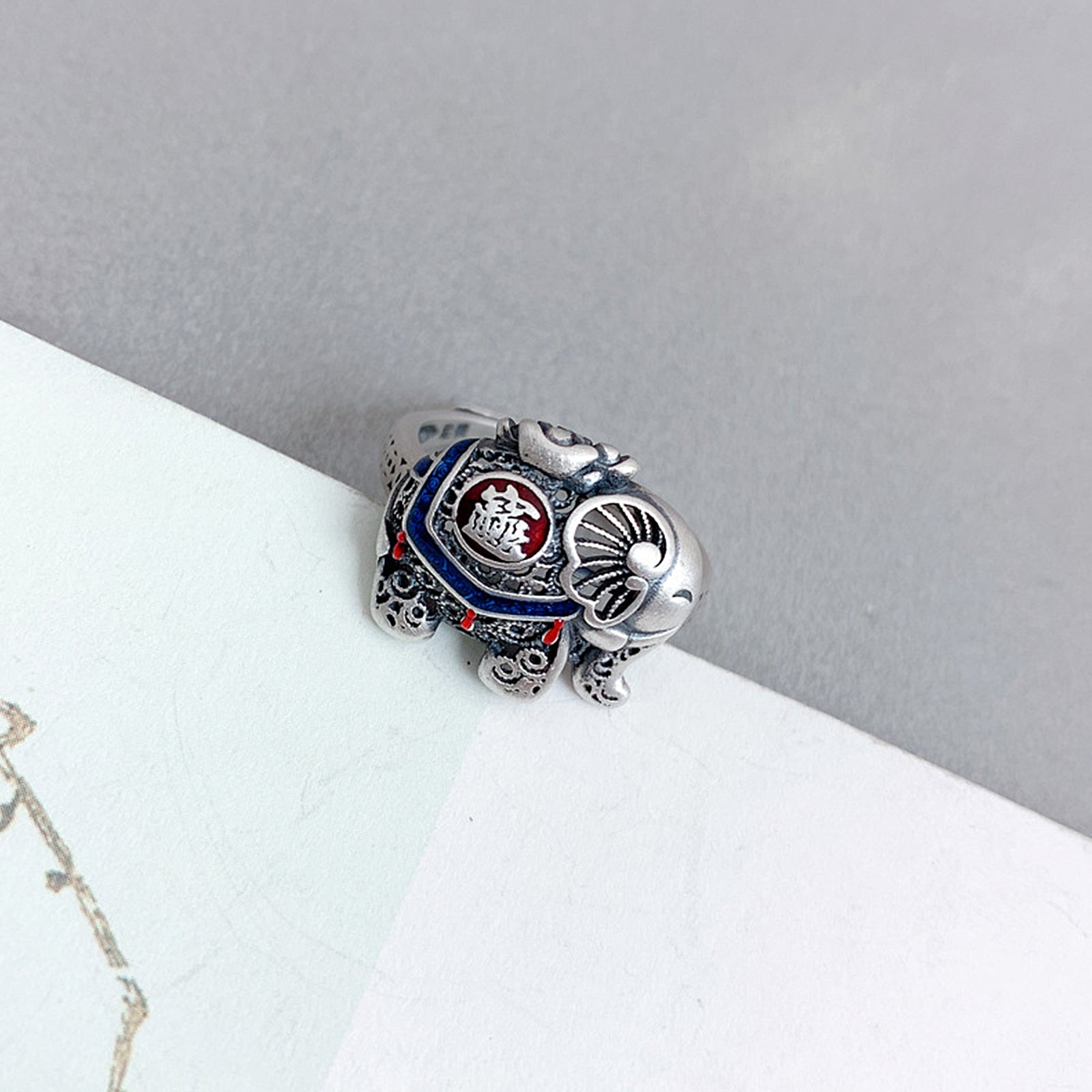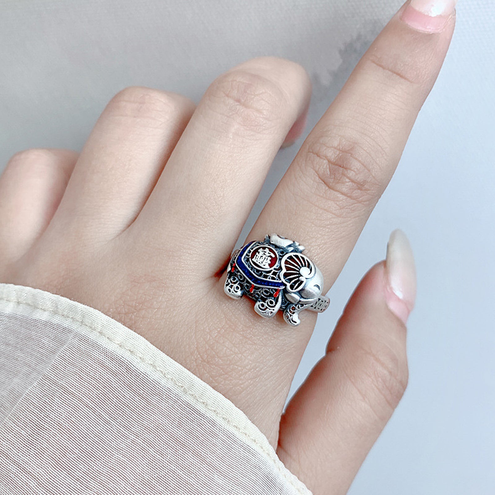 The body of the ring is made of high-quality metal, making it sturdy and durable. The designer cleverly integrated Ruyi elements and elephant elements into the shape of the ring, which is meticulous and layered, showing a unique charm.