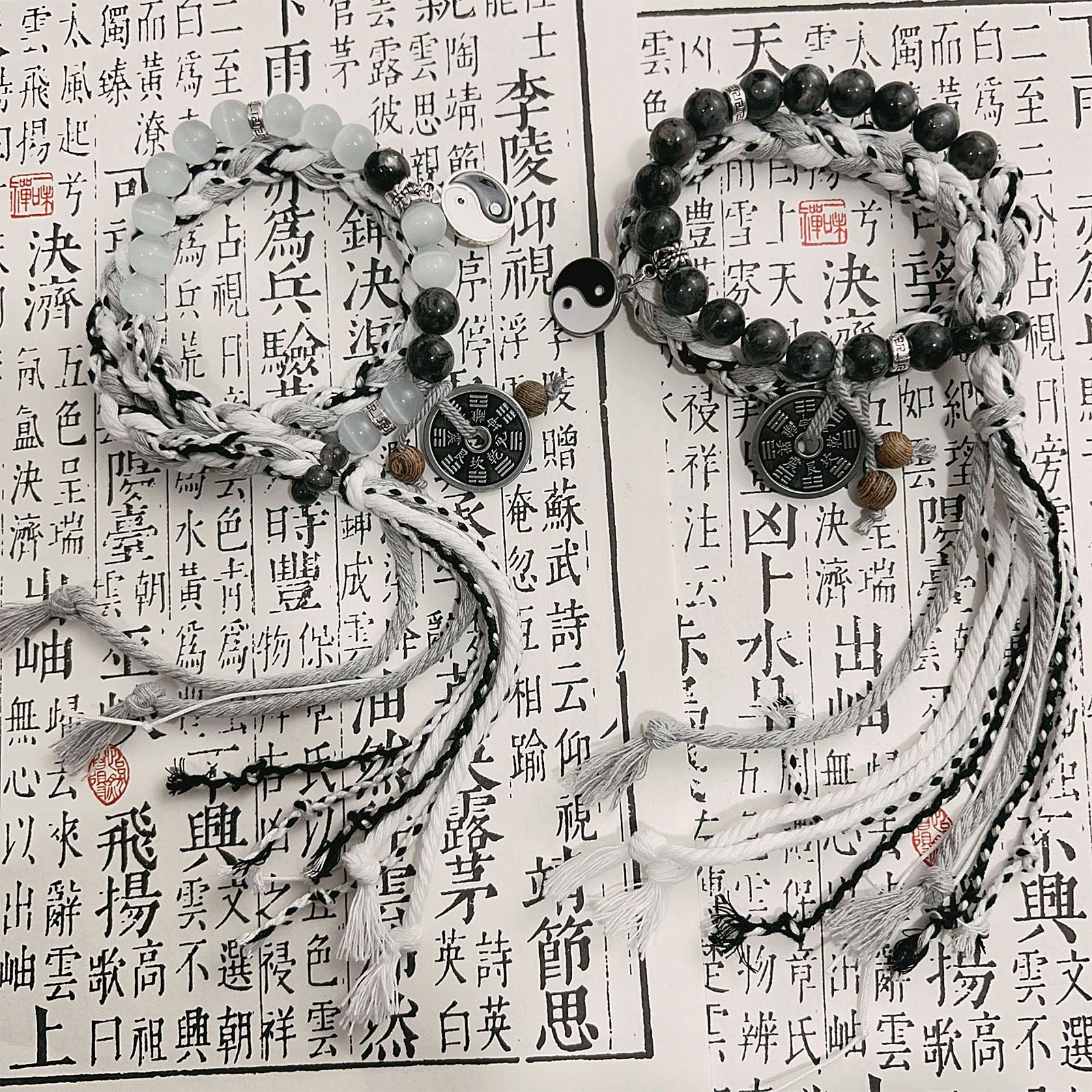 The second bracelet is also woven with black and white hemp rope, with mountain ghost money and Tai Chi cards, but combined with it is a glitter stone bracelet. Glitter stones emit sparkling light under the illumination of light, giving people a visually stunning effect. The combination of glittering stone bracelets, black and white hemp rope, and mountain ghost money retains the profound heritage of traditional culture and incorporates modern fashion elements, making it suitable for wearers who pursue individuality and unique style. Whether for everyday wear or special occasions, this bracelet will turn heads.