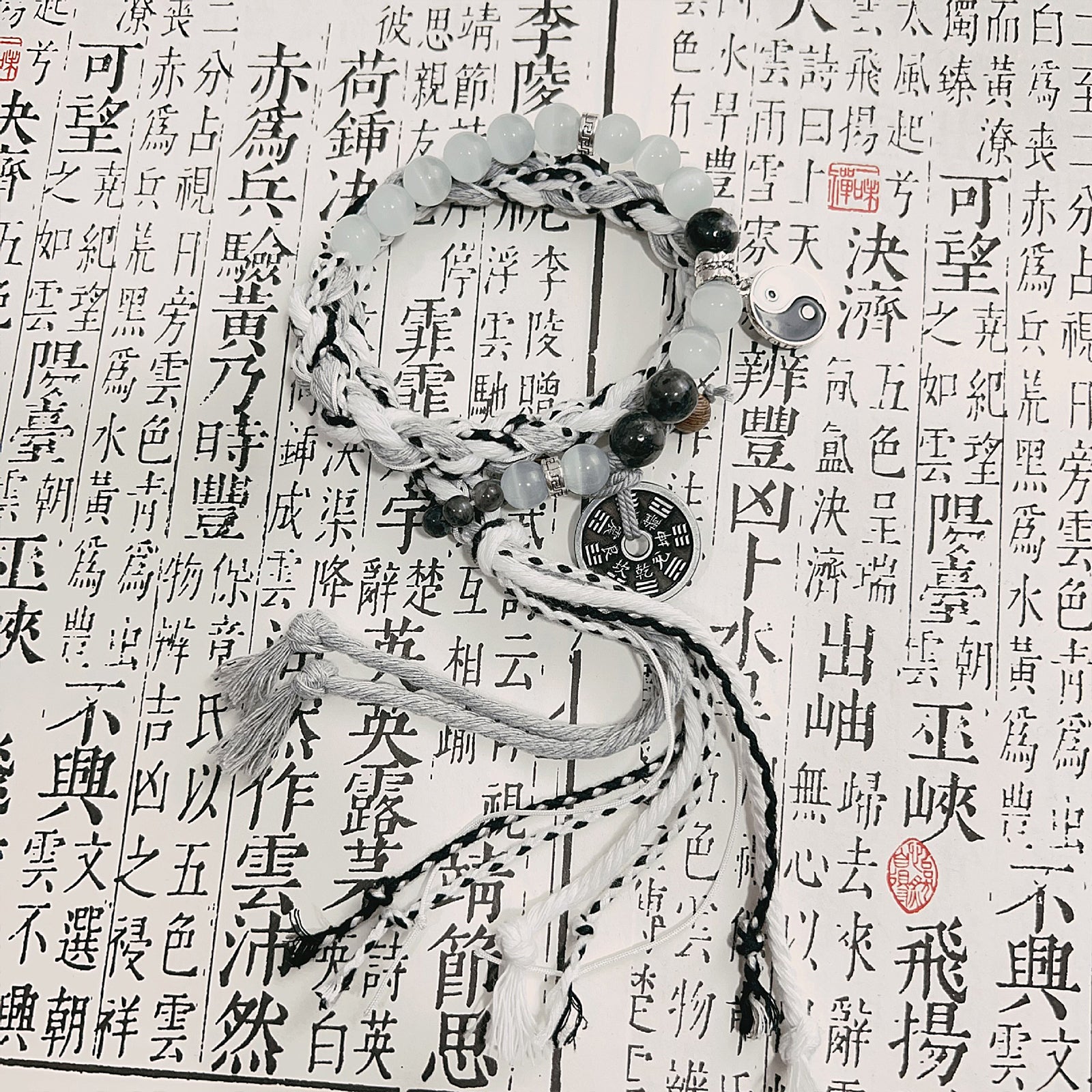 The first bracelet is woven with black and white hemp rope, symbolizing the harmony of yin and yang. It is simple and elegant, with a delicate texture, and comfortable to wear. In the middle, there is an exquisite mountain ghost spending money and a Tai Chi card. The mountain ghost spending money is engraved with exquisite Tai Chi patterns and traditional charms, which means the balance of yin and yang, exorcising evil spirits avoiding disasters, and attracting wealth. Combined with it is an opal bracelet. Each opal shows a unique optical effect, shining mysteriously like a cat's eye, adding to the unique charm of the bracelet. It has strong protective power and is suitable for wearing on various occasions. Whether it is daily life or formal occasions, it can show the wearer's unique taste and personal charm.