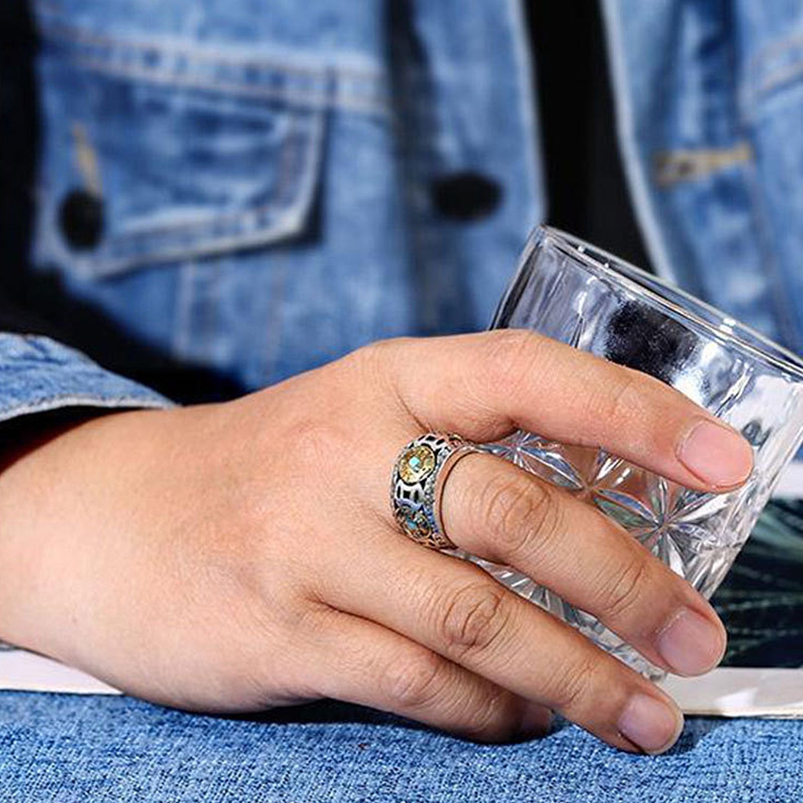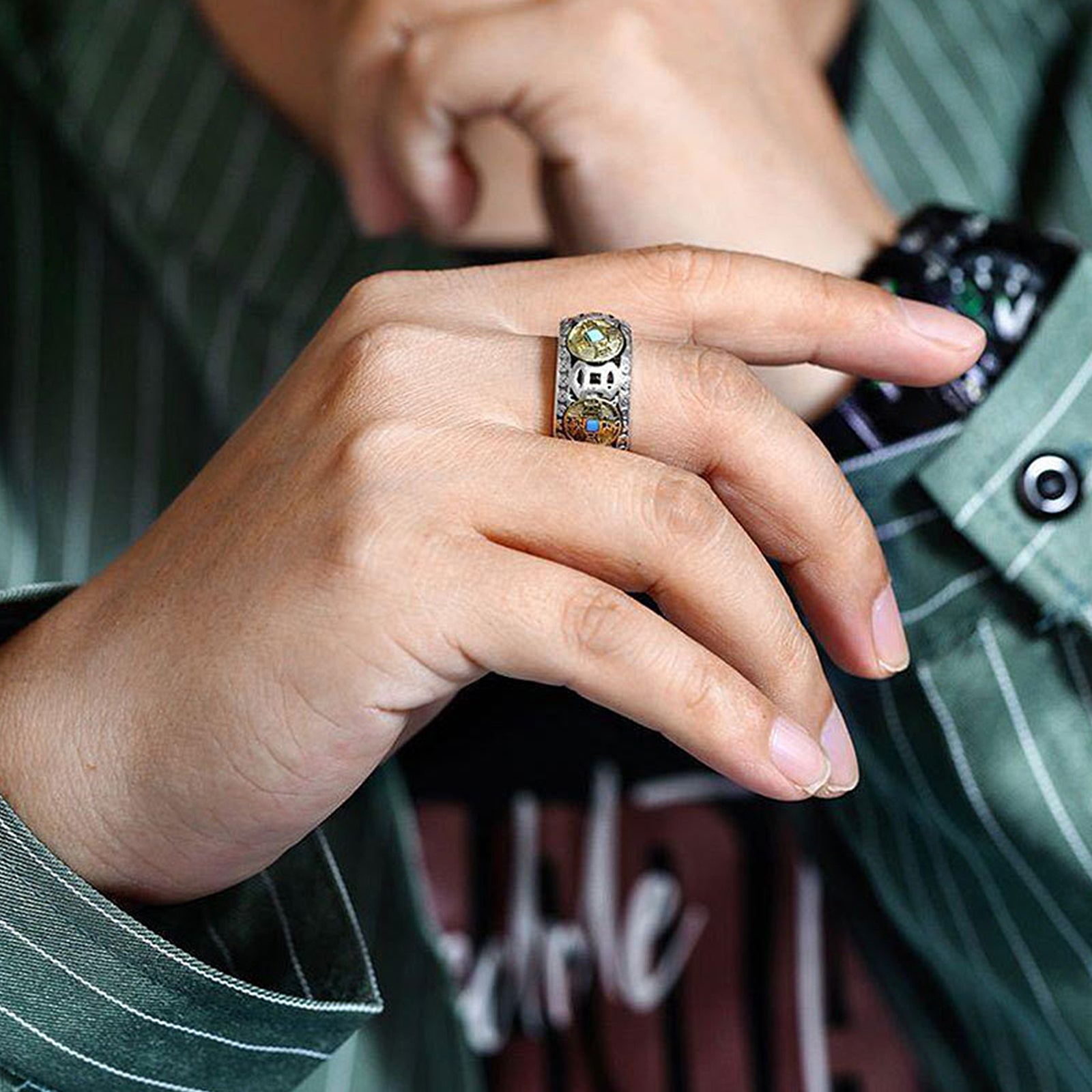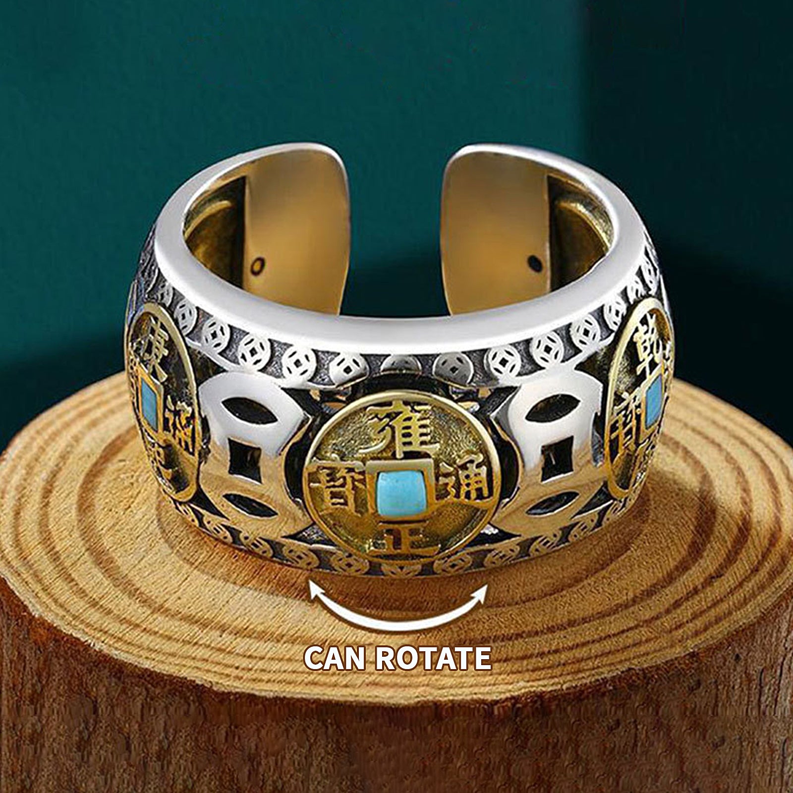 This ring is made from a combination of turquoise and Five Emperors coins. Turquoise, a mysterious and fascinating gemstone, exudes deep green and sparkling light, symbolizing the beauty of nature and the vitality of life, gathering energy for the wearer. Five Emperors' Money carries the luck of China's five prosperous emperors, represents prosperity and good luck, and brings wealth to the wearer. Combining the two creates a ring full of charm and mystery.
